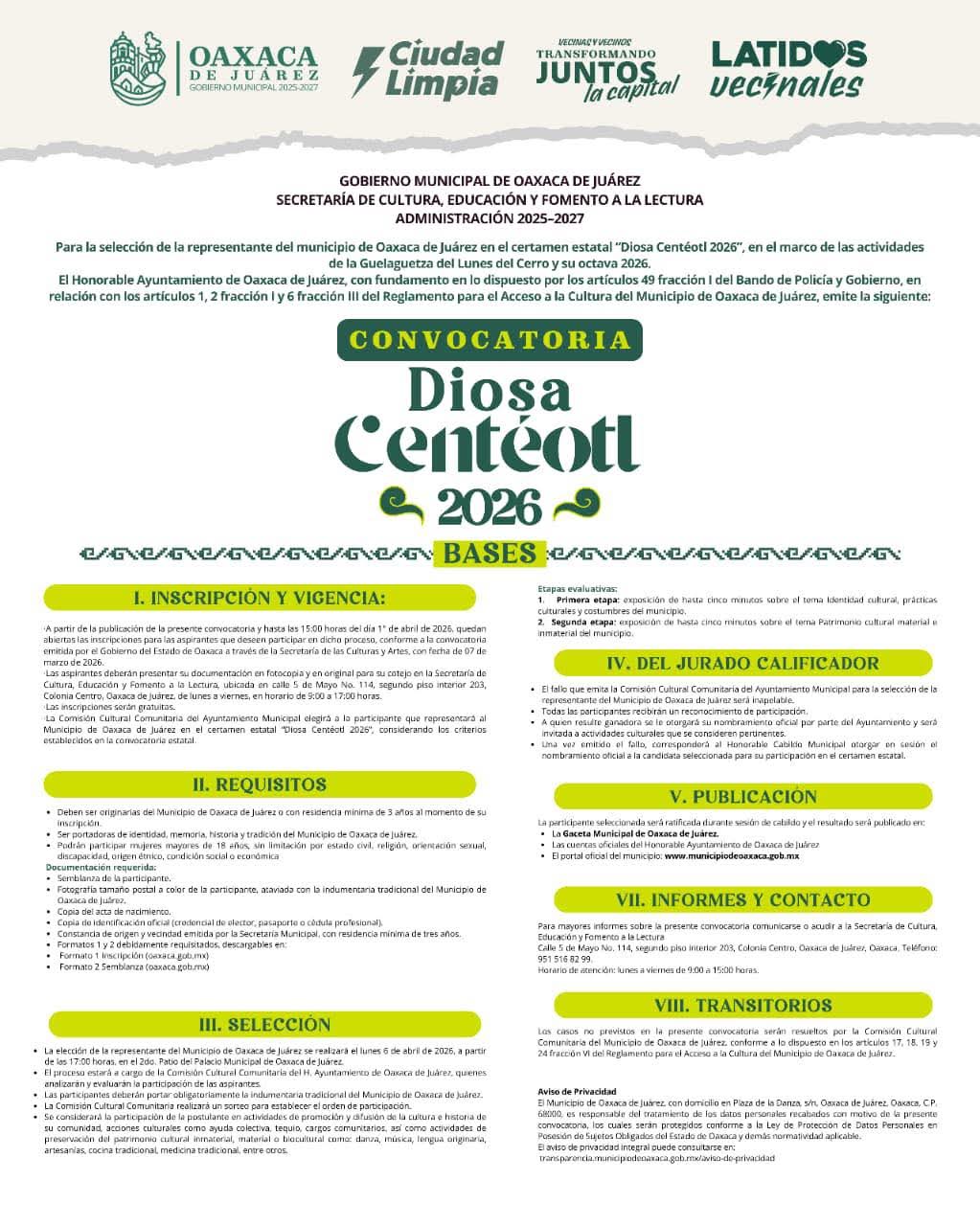 Oaxaca de Juárez convoca a elegir a su representante de Diosa Centéotl 2026