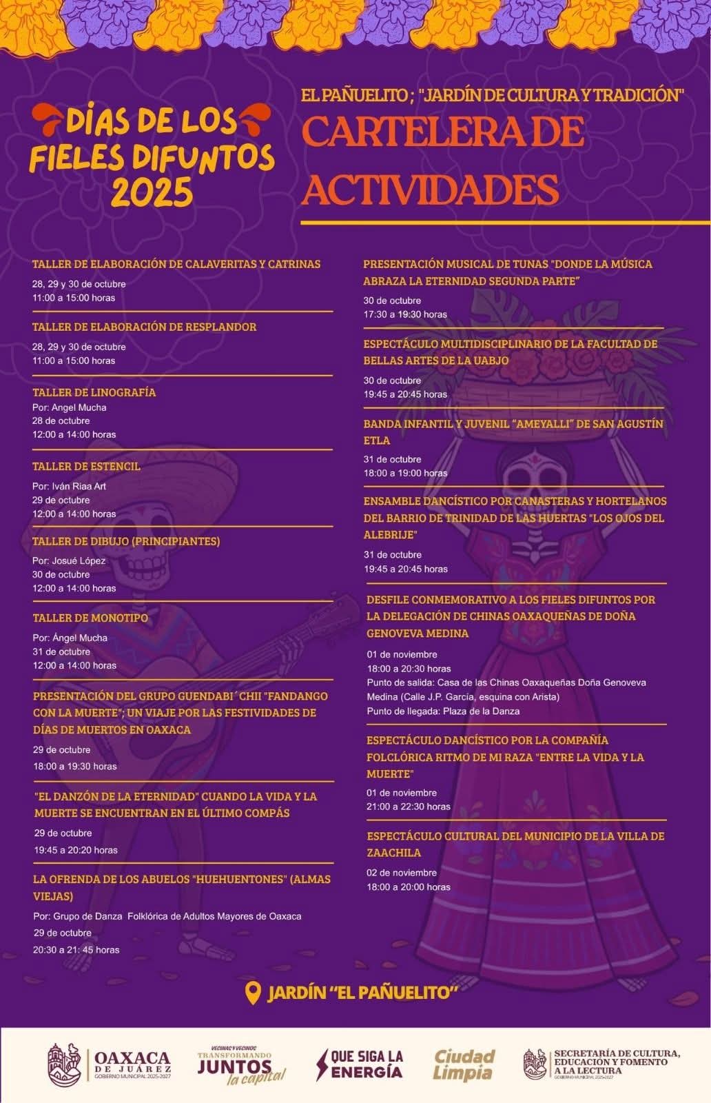 Como parte de esta conmemoración, el Jardín El Pañuelito se transformará en un Jardín de Cultura y Tradición con talleres de elaboración de calaveritas, catrinas, resplandores, estencil y linografía, además de presentaciones escénicas que muestran el talento oaxaqueño. Entre ellas destacan los espectáculos “Fandango con la Muerte”, “El Danzón de la Eternidad” y “La Ofrenda de los Abuelos Huehuentones”, así como el desfile conmemorativo de las Chinas Oaxaqueñas de Doña Genoveva Medina y el espectáculo dancístico “Entre la Vida y la Muerte”.