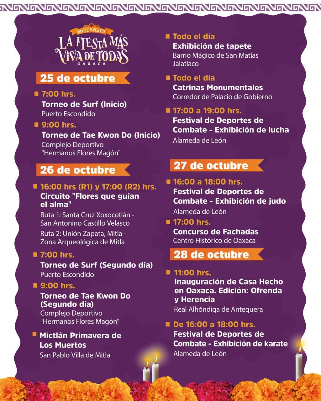 Oaxaca de Juárez, Oax., 27 de octubre de 2025.– El Municipio de Juárez invita a conocer la cartelera cultural de Día de Muertos 2025, una de las festividades más emblemáticas de la capital, que rinde homenaje a la vida y la memoria a través del arte, la música y la tradición. Con el lema “Oaxaca Ciudad Limpia y Segura, Eternamente Viva”, el gobierno municipal encabezado por el presidente Ray Chagoya invita a vecinas, vecinos y visitantes a disfrutar de un programa que llenará de color, cultura y energía los espacios públicos.