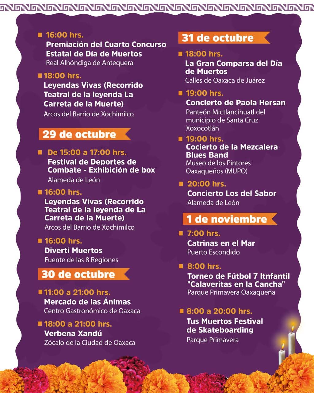 Del 28 de octubre al 1 de noviembre, la ciudad se convertirá en escenario de comparsas, exposiciones, conciertos y espectáculos que celebran la identidad oaxaqueña. Destacan la apertura del Sendero del Cempasúchil en la Calzada de la República y la magna comparsa “Vida y Alma de Oaxaca”, que recorrerá el Centro Histórico hasta el Panteón General. Este último espacio cobrará vida con la iluminación de sus pasillos, el video mapping “La Musa” y presentaciones musicales a cargo de bandas filarmónicas de Yaxe, Xochimilco y Cuilápam de Guerrero.